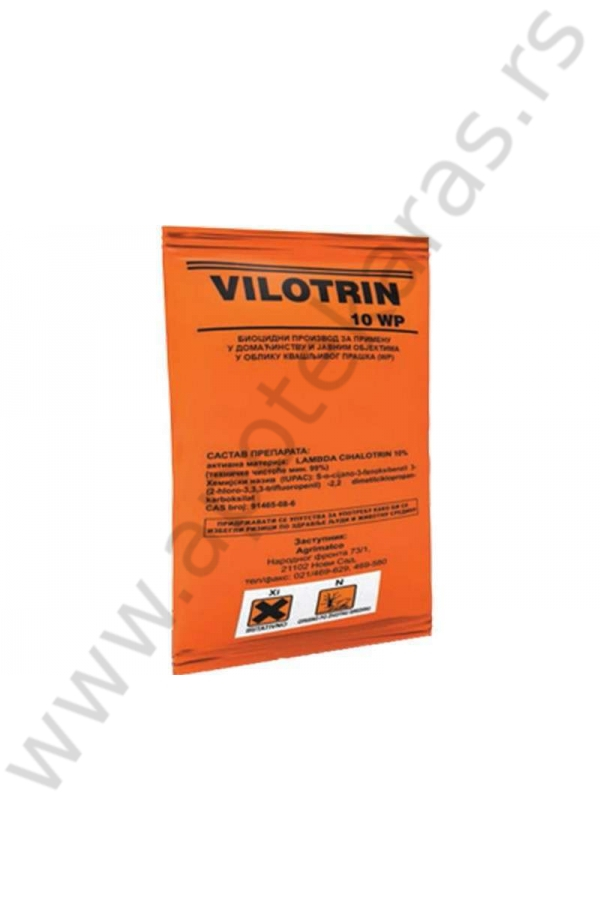 Aktivna materija: lambda cihalotrin (10% ) Formulacija: kvašljivi prašak (WP) Primena: Preparat VILOTRIN 10 WP koristi se: -za suzbijanje crne (Blatta orientalis) i smeđe (Blatella germanica) bubašvabe, tretiranjem zidova i podova prostorija, u količini 50 grama na 10 litara vode uz primenu 40-50 ml/m². -za suzbijanje žutih mrava (Monomorium pharaonis), tretiranjem zidova i podova prostorija, u količini 50 grama na 10 litara vode uz primenu 40 ml/m². -za suzbijanje kućne (Musca domestica) i stajske (Stomoxys calcitrans) muve, tretiranjem zidova i podova stambenih objekata, štala i staja, u količini 50 grama na 10 litara vode uz primenu 50 ml/m². -za suzbijanje komaraca tretiranjem unutrašnjih i spoljnih zidova objekata, u količini od 50 grama na 10 litara vode uz primenu 50 ml/m². Preporuke i napomene vezane za primenu: -Štetni insekti suzbijaju se prilikom dodira sa preparatom koji ostaje na isprskanim površinama. Depozit preparata je dugo postojan. -Preparat ne ostavlja fleke na površini koja se prska. Nema inhalaciono delovanje (ne deluje parama). -Preparat se koristi isključivo za tretiranje zidova i podova prostorija. -Preparat ne sme dospeti na namirnice i stočnu hranu. Ne tretirati direktno prehrambene i poljoprivredne proizvode i stočnu hranu. Preparat se nikako ne sme nanositi direktno na domaće životinje. -Potpuno očistiti tretirane površine pre primene preparata inače dolazi do smanjene efikasnosti. -Količina rastvora koja se utroši pri tretiranju zavisi od osobina samih površina odnosno podloga. -Manje količine se koriste na tvrdim i glatkim podlogama a veće na površinama kao malter, cigla, nelakirano drvo i druge neravne podloge. Takođe količina rastvora zavisi i od intenziteta napada štetočina. Za tretiranje jednog kvadratnog metra u zavisnosti od svih ovih uslova trebalo bi koristiti od 30-50 ml rastvora.
