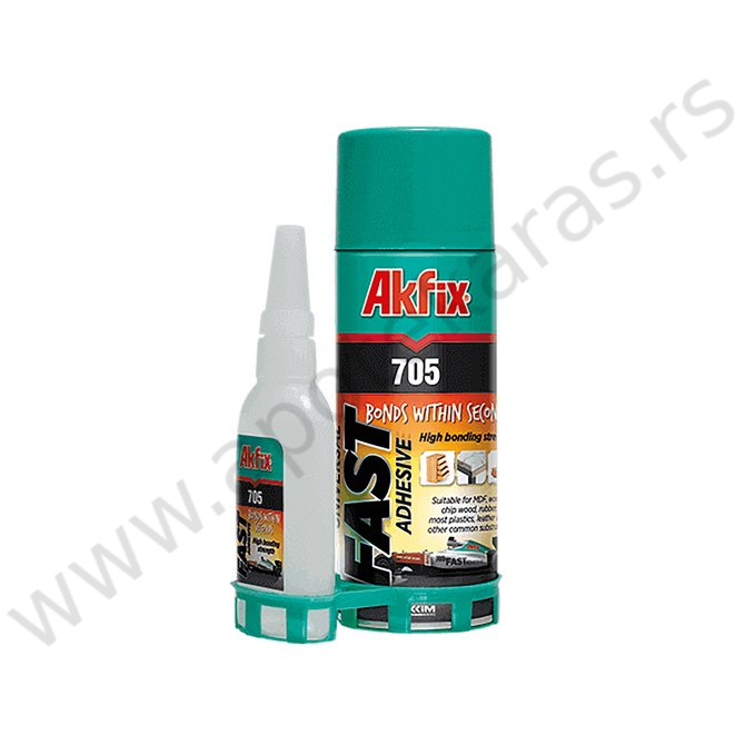 Akfix 705 univerzalni lepak ima veliku snagu lepljenja, veliku viskoznost, ne kaplje i ne curi, što ga čini pogodnim za upotrebu na vertikalnim površinama. Sastoji se od dve komponente: 50 g lepka + 200 ml sprej. Na jednoj površini se naprska sprej, a na drugoj površini koja se lepi se nanosi lepak. Sprej povećava brzinu prianjanja.