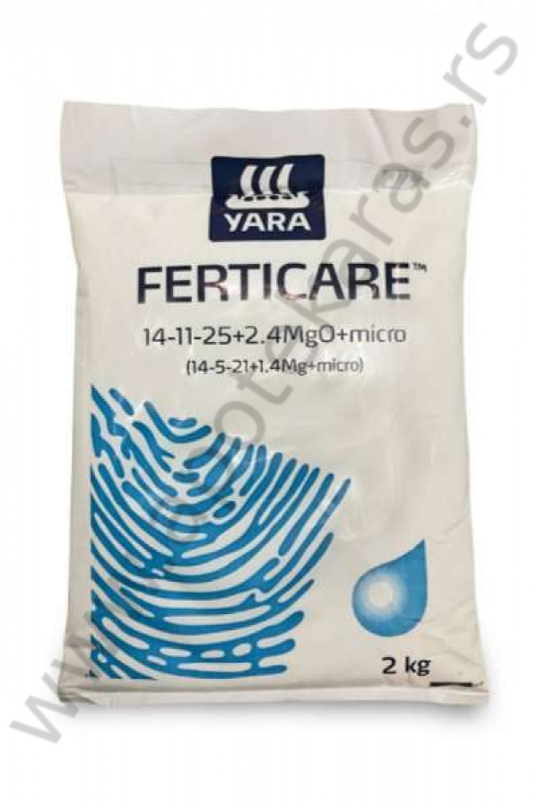 Pogodan za ishranu svih vrsta biljaka tokom cele vegetacije zbog idealnog odnosa NPK elemenata. Značajno ubrzava cvetanje i poboljšava zametanje plodova. Idealan je za folijarnu prihranu svih ratarskih, povrtarskih, voćarskih kultura, vinove loze, cveća i ukrasnog bilja. N P2O5 K2O MgO S B Cu Fe Mn Mo Zn Pakovanje (kg) FerticareTM 14-11-25 14 11 25 2,2 1,8 0,02 0,1 0,1 0,1 0,002 0,1 0.01, 0.1, 0.5, 2, 25