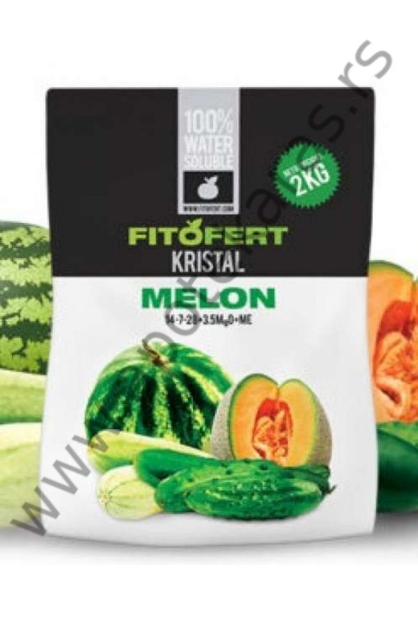 FitoFert Kristal MELON 14:7:28+3.5MgO+ME je đubrivo za ishranu zasada krastavca, kornišona, lubenice, dinje i tikvice, na otvorenom i u zaštićenom prostoru. Formulacija đubriva je u potpunosti prilagođena navedenim biljnim kulturama i pruža im optimalne količine hraniva tokom rasta, plodonošenja i sazrevanja.Poseduje rezidualnu kiselosti nizak nivo EC-a, pa može da se koristi i za slane i za tvrde vode. U zavisnosti od projektovanog prinosa, biljne kulture, kao i od uslova gajenja preporučuju se i odgovarajuće količine po hektaru.