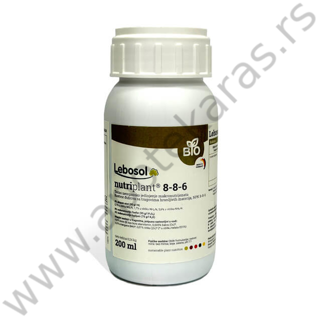 Lebosol®- NutriplantEC ĐUBRIVONPK đubrivo 8-8-6 u vidu rastvora sa izbalansiranim sadržajem mikroelemenata za folijarnu primenuSastav:8 % ukupan azot (95 g/l N), (1,7 % u obliku NH4-N , 0,7 % u obliku NO3-N, 5,6 % u obliku NH2-N)8 % vodorastvorljiv fosfor (95 g/l P2O5)6 % vodorastvorljiv kalijum (75 g/l K2O)Sadržaj mikroelemenata: 0,01 % B; 0,005 % Cu*; 0,01 % Mn*; 0,01 % Zn* (* u obliku helata EDTA)Svi mikroelementi se nalze u vodorastvorljivom obliku.PreporukeU svim kulturama u cilju snabdevanje biljke neophodnim makro I mikro elementima koji omogućavaju energetsku stabilnost, vitalnost, kvalitet procesa fotosintezeU svim kulturama U svim kulturama 3 – 7 l/ha uz utrošak minimalno 200l vode, naročito poštovati prilikom tretmana osetljivih kultura i prilikom proizvodnje u zaštićenom prostoru (0,25-0,5). Nije preporučljiva primena tokom cvetanja.U slučaju stresa i nepovoljnih uslova preporučena doza primene je 5l/haRatarske kulture: 3-5l/ha. 2-3 tretmana u fazi bokorenja, vlatanja I na početku klasanja. Uljarice: 3-5 l, 1-2 tretmana u fazi intenzivnog porasta. Voćarske kulture: 3-5 l /ha, 1-3 tretmana od faze formiranja ploda. Povrtarske kulture: 2-4 l /ha, 2-3 tretmana od faze presađivanja i u tokom intenzivnog porastaMešanje sa đubrivima koja sadrže kalcijum, magnezijum i mangan nitrat nije preporučljivo.